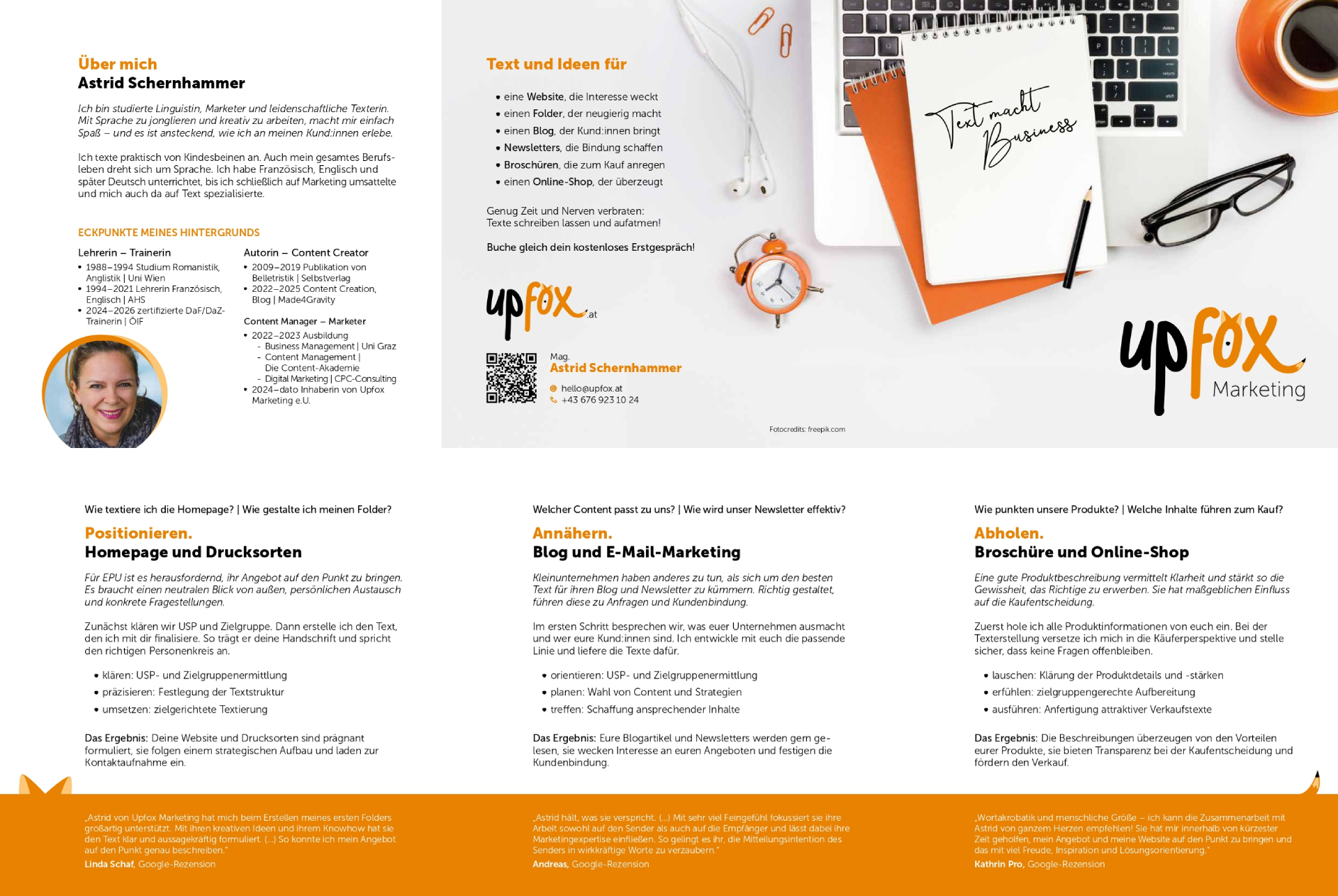 Ich bin Astrid Schernhammer, Marketer und auf Werbetexte spezialisiert. Meine Aufgabe ist es, dein Angebot so zu präsentieren, dass sich deine Zielgruppe unmittelbar angesprochen fühlt.