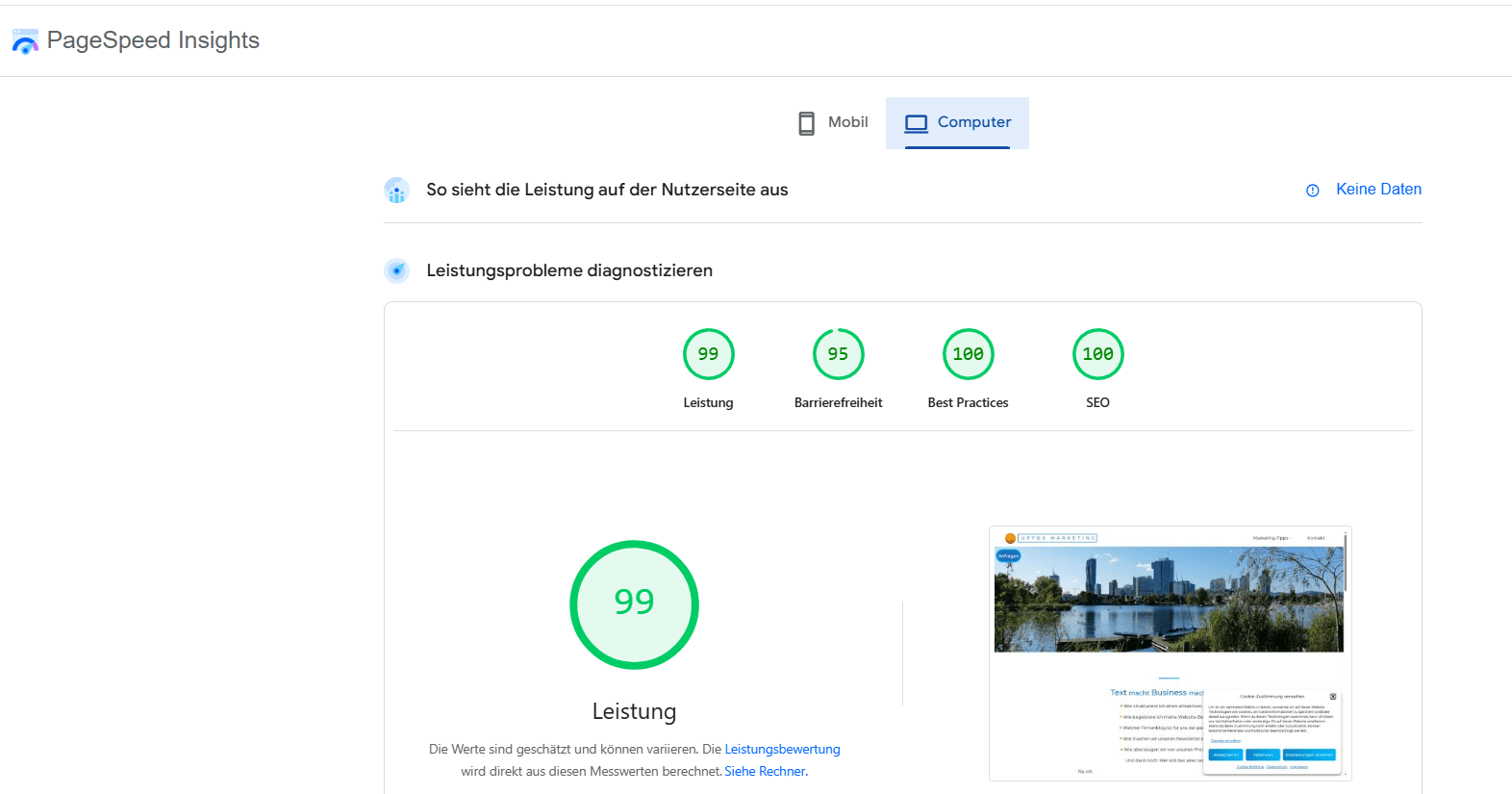 Aktuelle Testresultate zu Funktionalität, Leistung, Barrierefreiheit, Best Practices und SEO siehst du am Beispiel von upfox.at in den Screenshots weiter unten. Sie zeigen, dass ich weiß, wovon ich rede, und warum es mir ein Anliegen ist, dahingehend Empfehlungen auszusprechen. Nichts ist vom Himmel gefallen. Ich hatte das Glück, Top-Dienstleister zu erwischen, die mir all das ermöglicht haben.